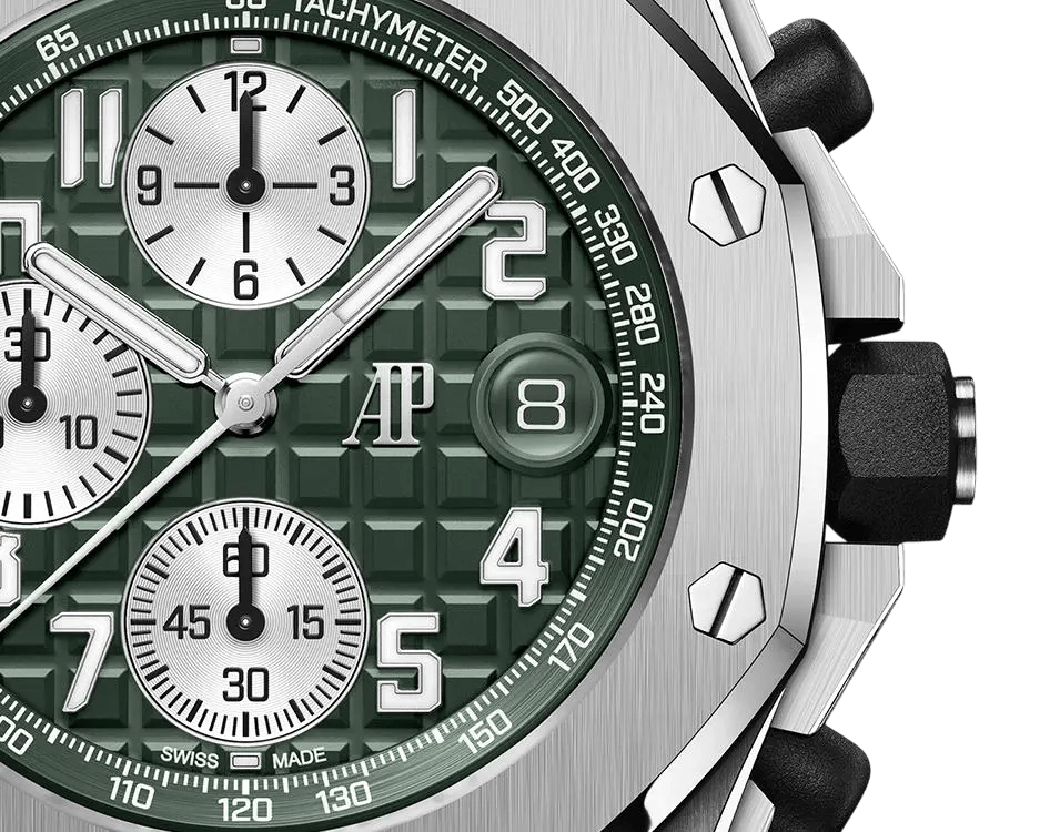 The green “Méga Tapisserie” dial adds a distinctive character. It shifts subtly under different lighting and is paired with white gold hands and markers for crisp legibility. The chronograph layout is balanced and easy to read, while the color makes it stand out from traditional Offshore models without feeling over the top.