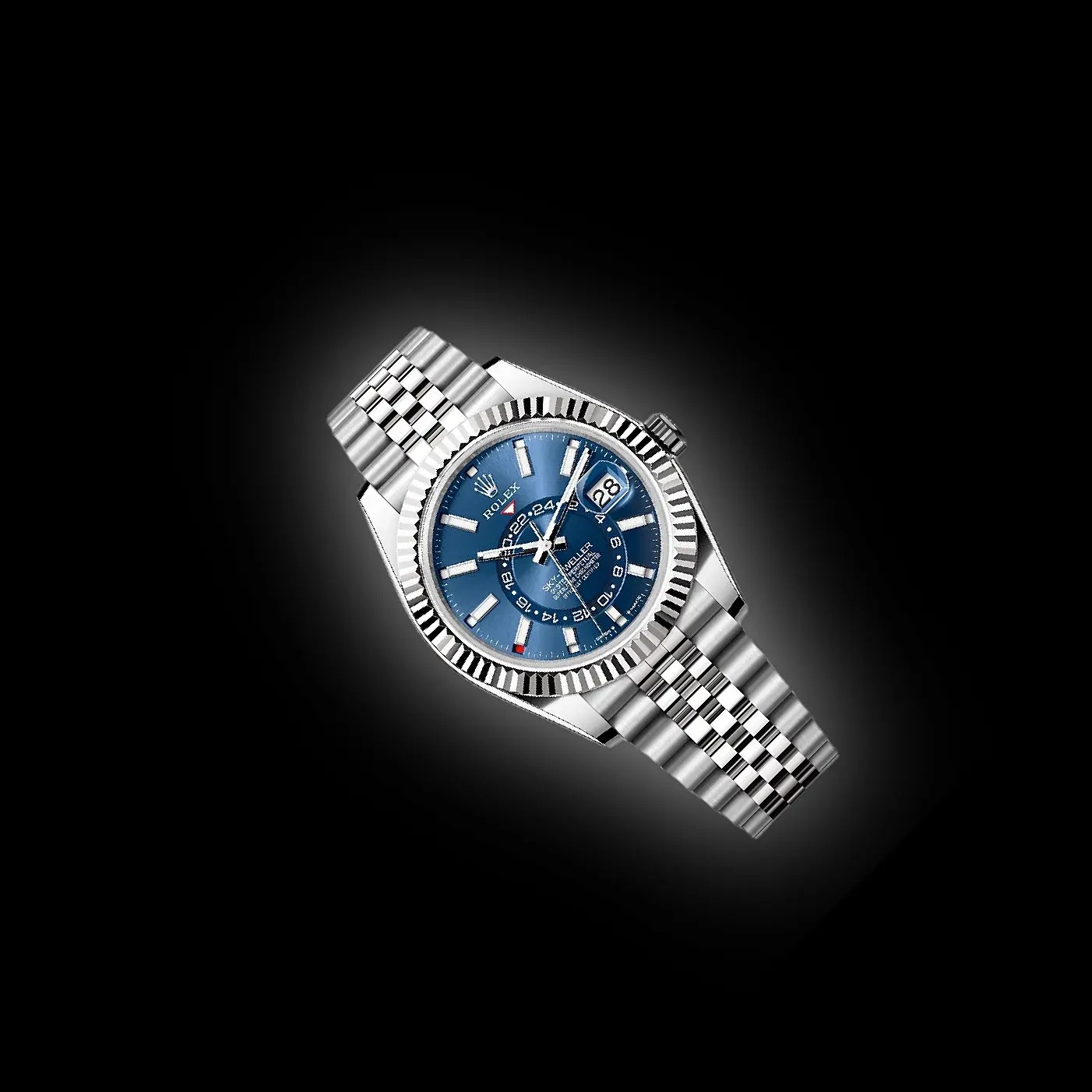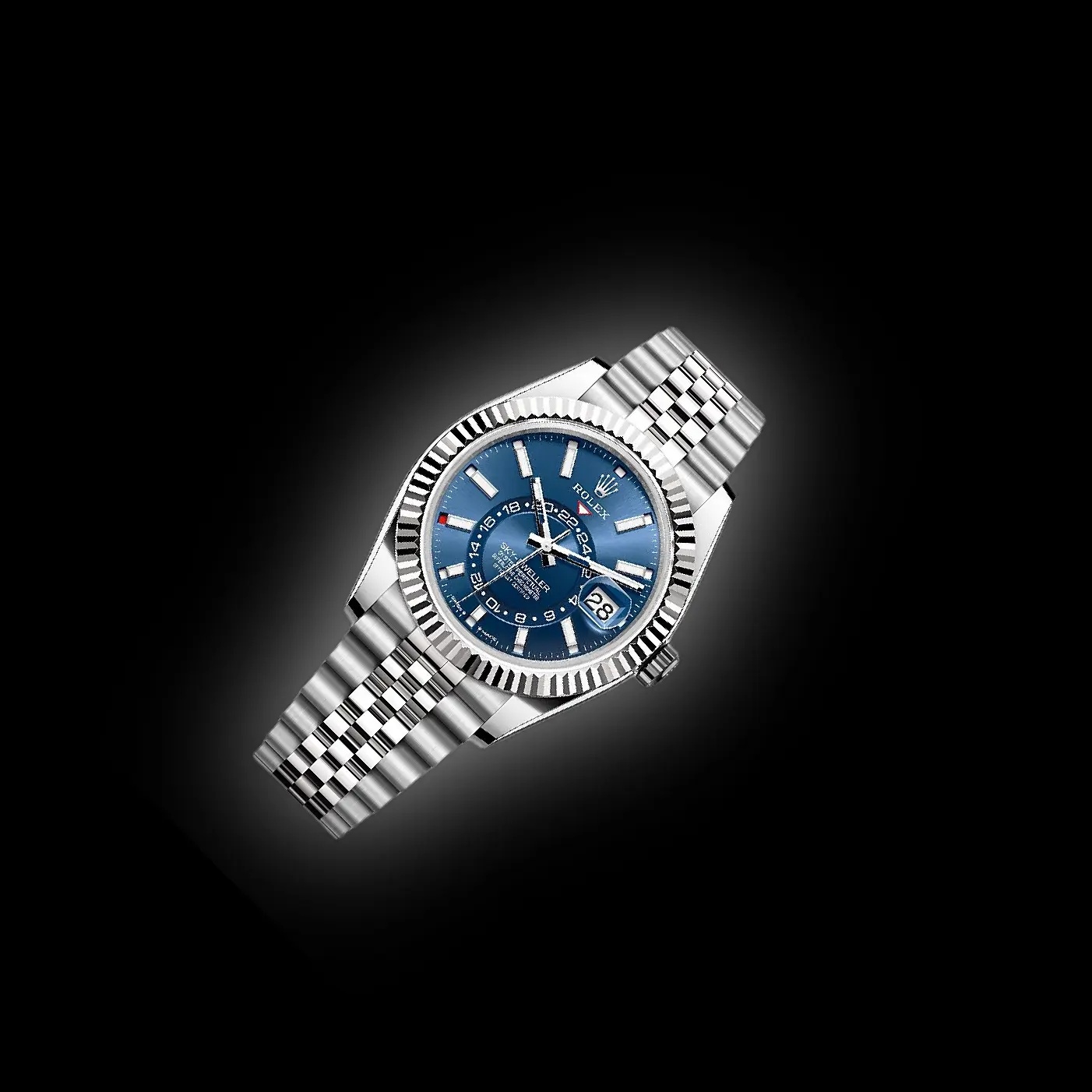 The Rolex Sky-Dweller, reference 336934 pairs the strength of Oystersteel with the elegance of an 18K white gold fluted bezel, creating a sophisticated travel watch with unmistakable presence. The 42mm case is complemented by the Jubilee bracelet, offering both comfort and a refined aesthetic. Its sunray-finished blue dial provides a vivid contrast to the polished bezel, while showcasing the watch’s complex yet balanced layout.