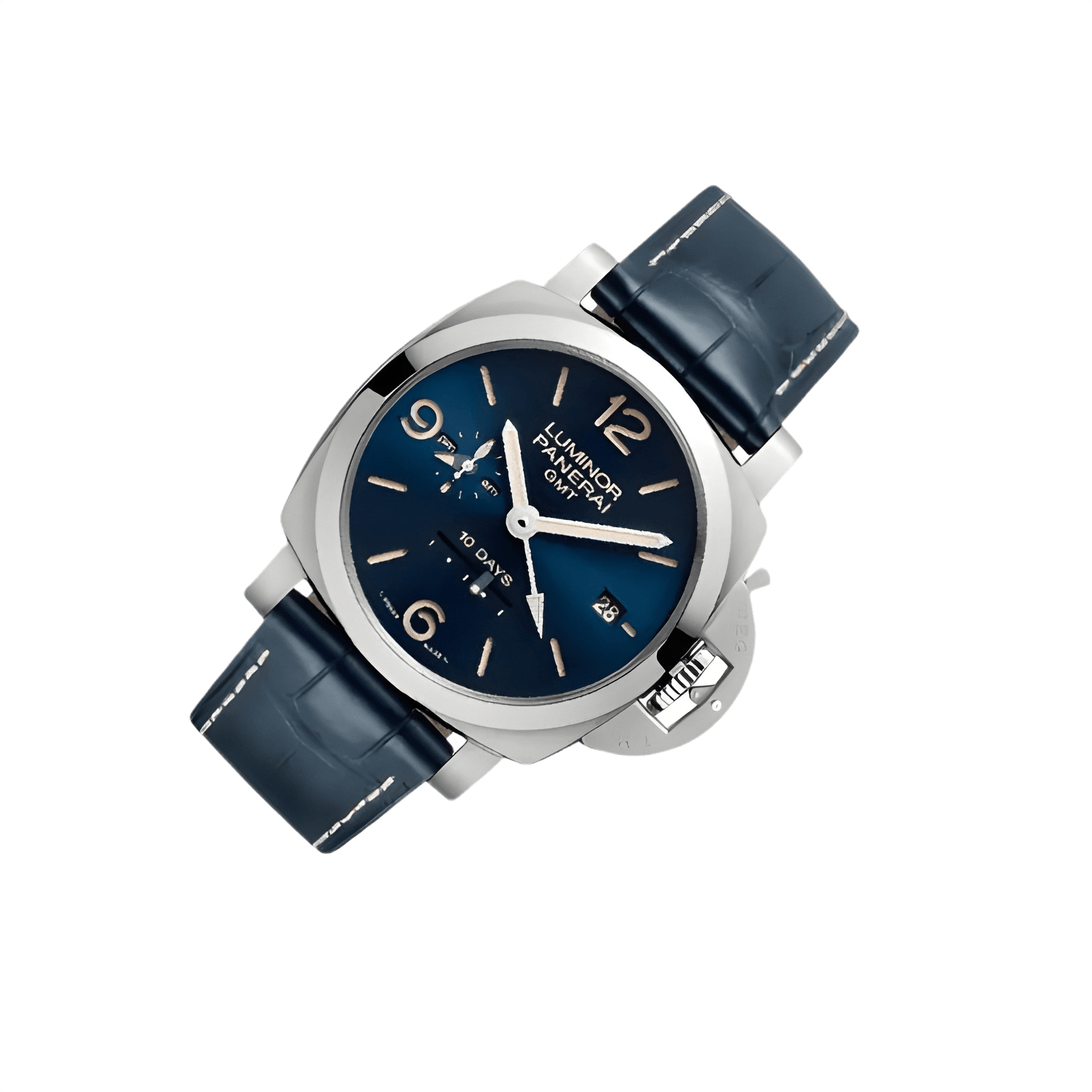 The deep blue dial features a vertical satin finish that catches the light beautifully. Large luminous Arabic numerals and hour markers provide excellent legibility, while the small seconds subdial with an AM/PM indicator sits at nine o’clock. A linear 10-day power reserve display is placed at six o’clock, and the date window at three completes the balanced layout. The GMT hand allows tracking of a second time zone, making this watch as practical for travel as it is for daily wear.