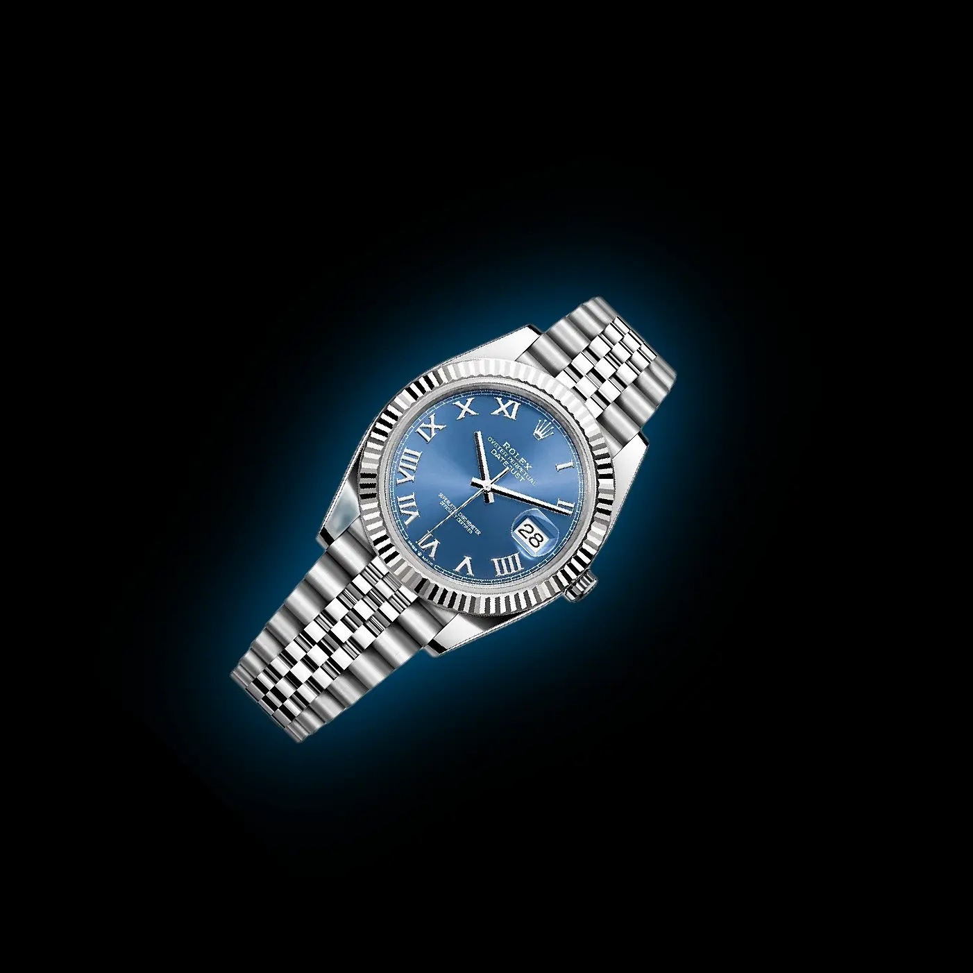 The sunray blue dial is rich and dynamic, shifting from deep navy to a brighter tone as the light moves across it. The applied Roman numerals add a classic touch, with the “VI” set in diamonds for an extra note of elegance. The date window at 3 o’clock, magnified by the Cyclops lens, is both functional and unmistakably Rolex.
