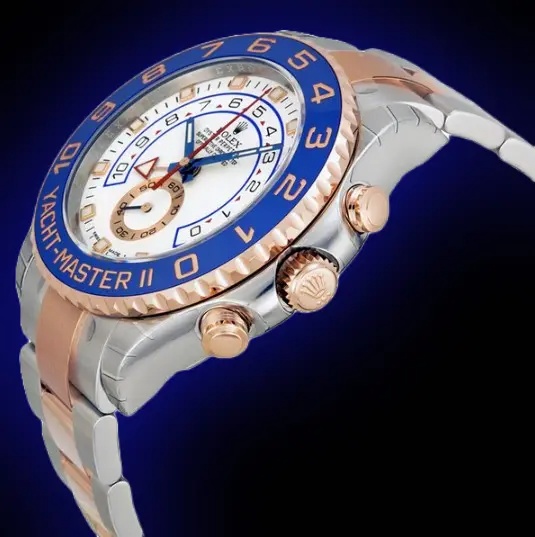 The Rolex Yacht-Master II, reference 116681 is a statement piece within the Rolex professional lineup, built for both precision timing and unmistakable style. The 44mm case combines Oystersteel with 18K Everose gold, giving it a balanced mix of durability and warmth. The polished surfaces and robust proportions give it strong wrist presence without feeling overwhelming.